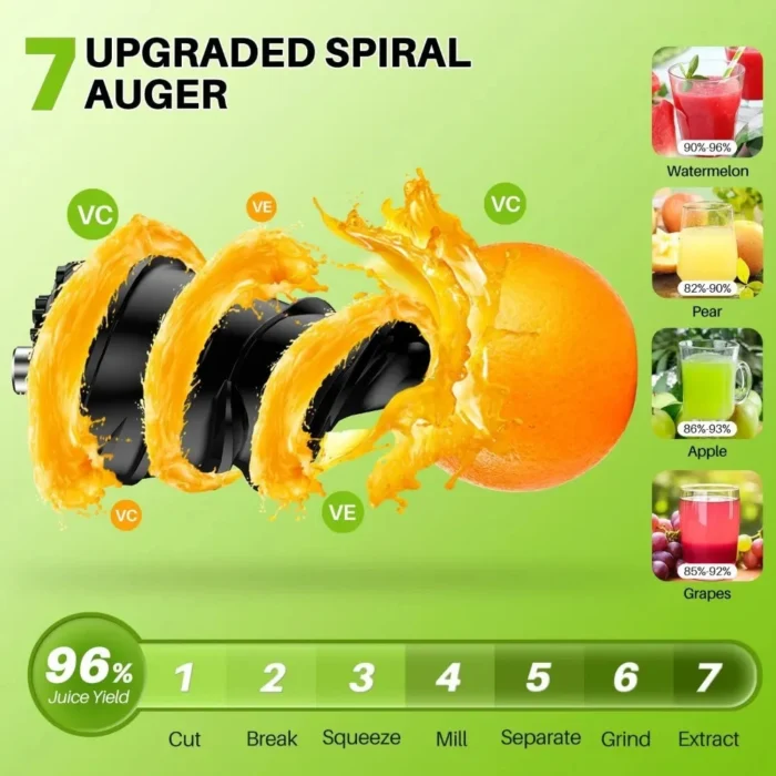 • 🍹【300W HIGH POWER MOTOR】The upgraded auger juicer machine, equipped with a 300W motor, utilizes its low-speed and stable operation method to perfectly achieve a 96% juice yield. Also, its 7-stage juicing method can also effectively prevent the nutritional value of fruits and vegetables from being lost during juicing. Compared to traditional juicers, this cold press juicer machine has fewer air bubbles and retains more vitamins and minerals
