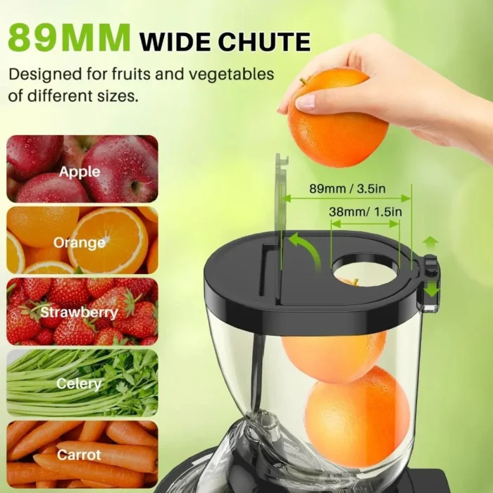 • 🍹【89mm DUAL FEED CHUTE】The smaller inlet for strip ingredients, and the large inlet can handle a wide variety of fruits and vegetables, easily accepting large pieces of fruits and vegetables, helping you save a lot of preparation time and greatly improving the efficiency of the juicing process. Equipped with a booster that allows ingredients to pass through more smoothly, which greatly improves the efficiency of juicing