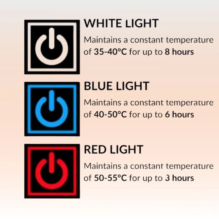 Tailor your warmth with three heating settings that allow you to adjust the temperature to suit your comfort level. Whether you’re out for a gentle walk or engaging in vigorous outdoor activities, control your heat with just a simple press.
