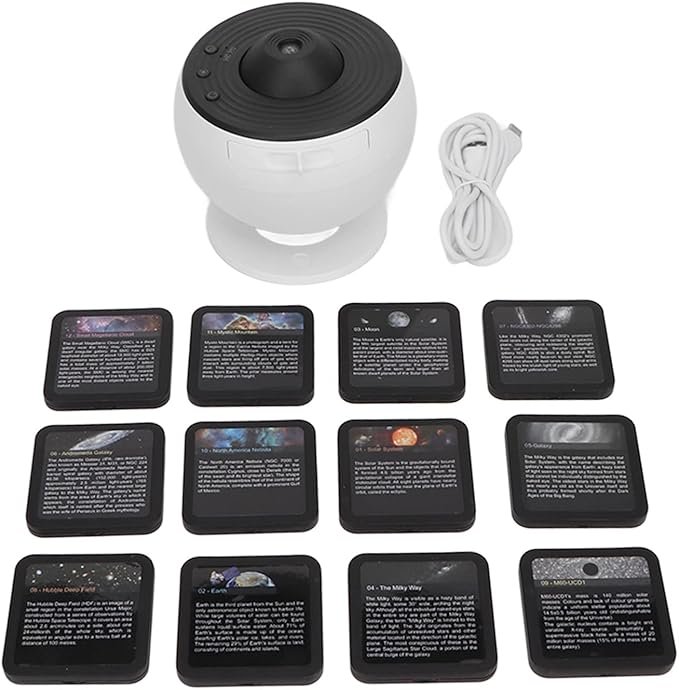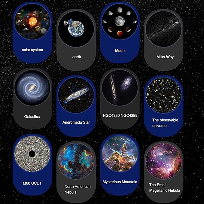 • [Upgraded 12-in-1 Galaxy Projector] The sky projector lamp is equipped with 12 film trays with different contents: , Solar System, Earth, , , Galaxy, NGC4302-NGC4298, Hubble Field, M60–UCD1 , America Nebula, Mystic Mountain and Small Magellanic . You can these slides in different scenes. Great for bedroom decoration for children, teenage girls, and adults. 【Timed Off and Silent Design】The Planetarium Galaxy Projector operates silently, creating a soothing sleeping environment. The rotation rate mimics cosmic changes and will be slow. While sleeping, the sky projector light can be set to turn off in 1 or 2 hours. If you forget to set the timer, it will automatically turn off 4 hours, but you can turn it back on if you want to continue using it.