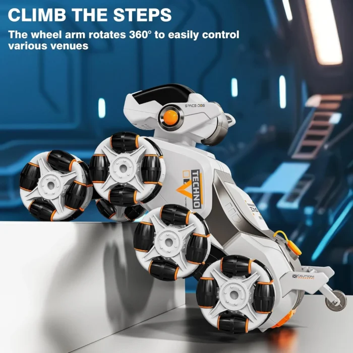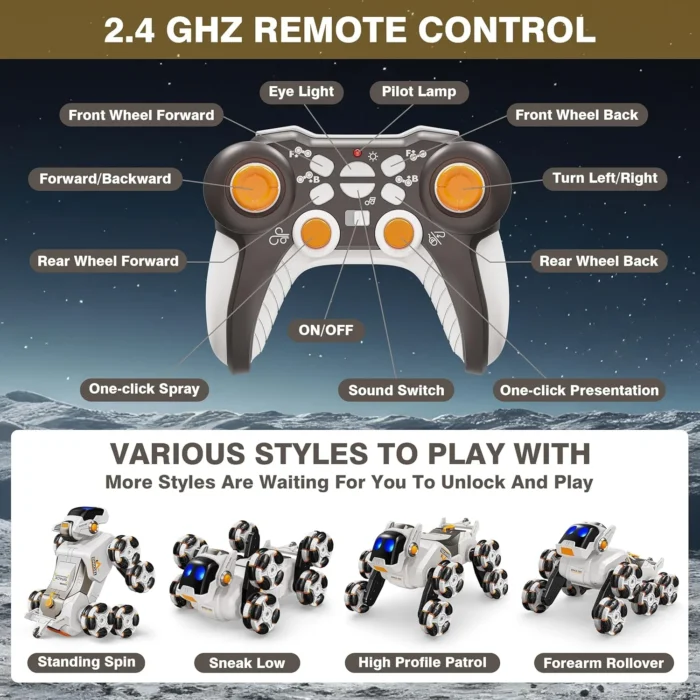 8WD Remote Control Stunt Car: The cool 2.4GHz remote control robot dog car is equipped with eight wheels. In addition to the basic forward and backward movements, it can also easily perform 360 ° turn, crawl, drift and other stunts.